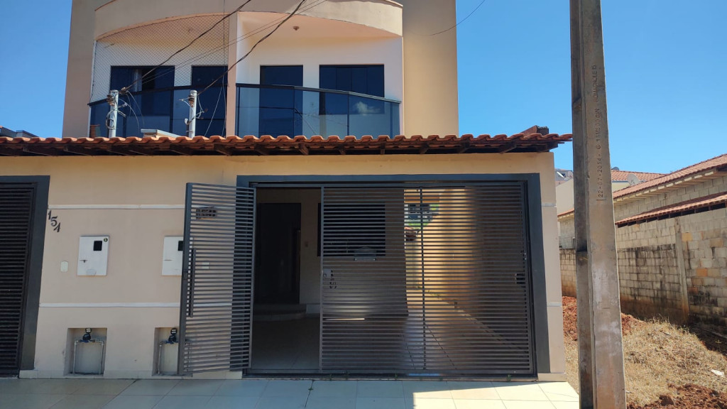 2 quartos (sendo 1 suíte e com varanda), 2 banheiros sociais (1 na parte superior e outro na parte de baixo), sala, cozinha grande, área de serviço coberta, corredor lateral e garagem com portão eletrônico.
